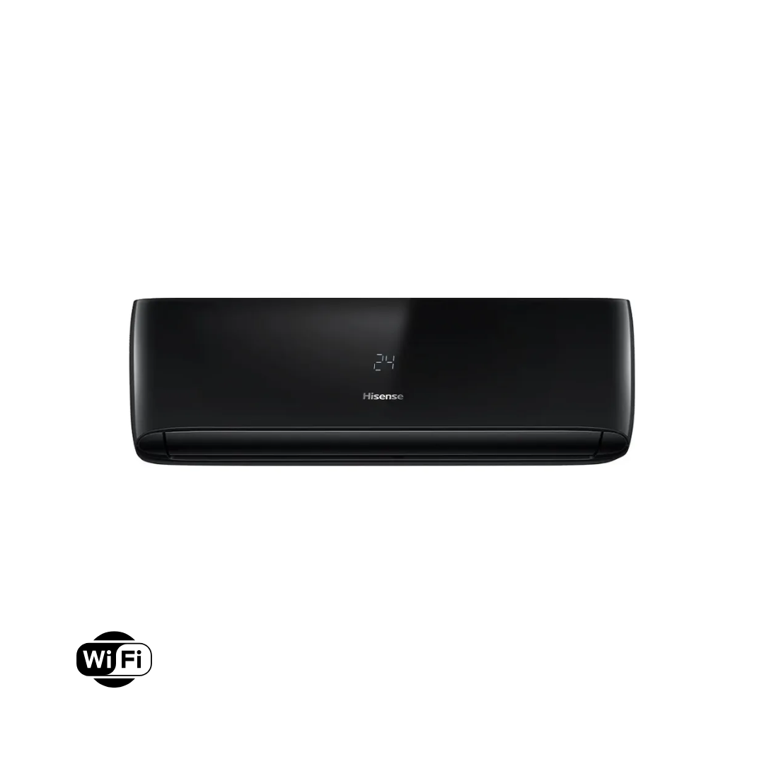Aire acondicionado Hisense 18,000 BTU Inverter 220V con WiFi, recomendado para áreas de 28 a 35 m². Potente, eficiente y con diseño moderno en color negro. Controla la temperatura desde tu smartphone con su módulo WiFi incorporado.