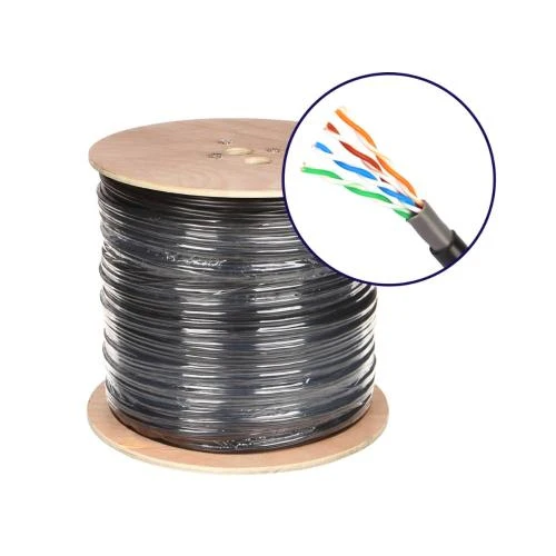 Cable de red de alto rendimiento para instalaciones en exteriores. Soporta velocidades hasta 1 Gbps, con recubrimiento resistente a sol, humedad y condiciones climáticas.